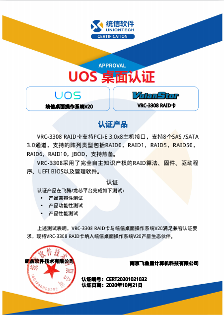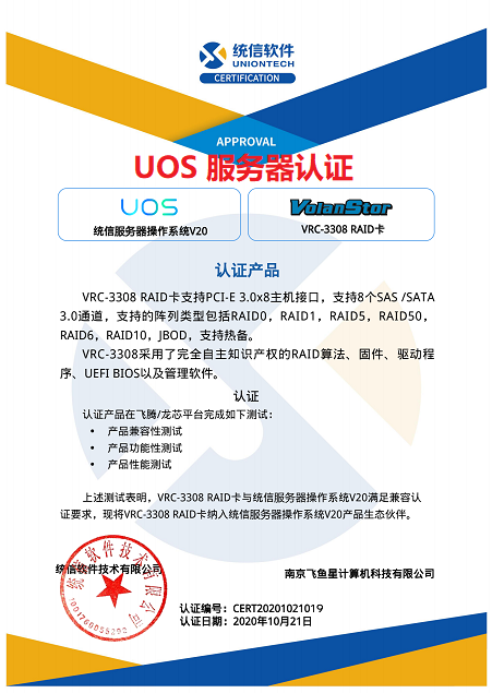 自主知識產權的 RAID 算法、固件、BIOS、驅動和管理軟件 硬件元器件、PCB、貼片等國產化率可以達到雙九五標準 支持中標麒麟、銀河麒麟、UOS 等國產操作系統 可支持國科、百熬、昆侖等國產固件 支持龍芯、申威、飛騰等國產處理器 可以通過篩選獲得寬溫產品