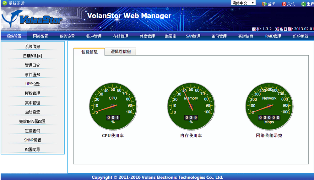 | 掉電保護 | 通過SP100檢測UPS掉電,在設定的時間內正常關閉存儲,并可以通知其他服務器 | |||||
